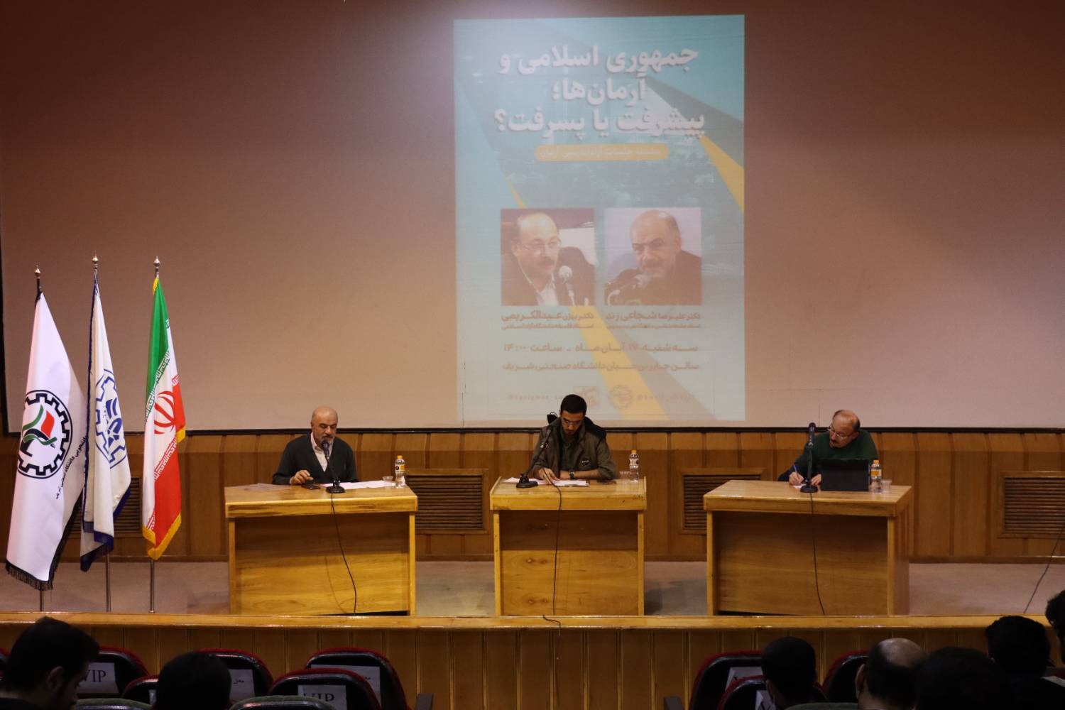این نشست به منظور رسیدن به پاسخ پرسش "جمهوری اسلامی در حرکت به سمت آرمانهای خود موفق بوده است یا خیر؟" برگزار شد و دکتر علیرضا شجاعیزند استاد جامعه شناسی و دکتر بیژن عبدالکریمی استاد فلسفه پیرامون این موضوع به سخنرانی پرداختند.