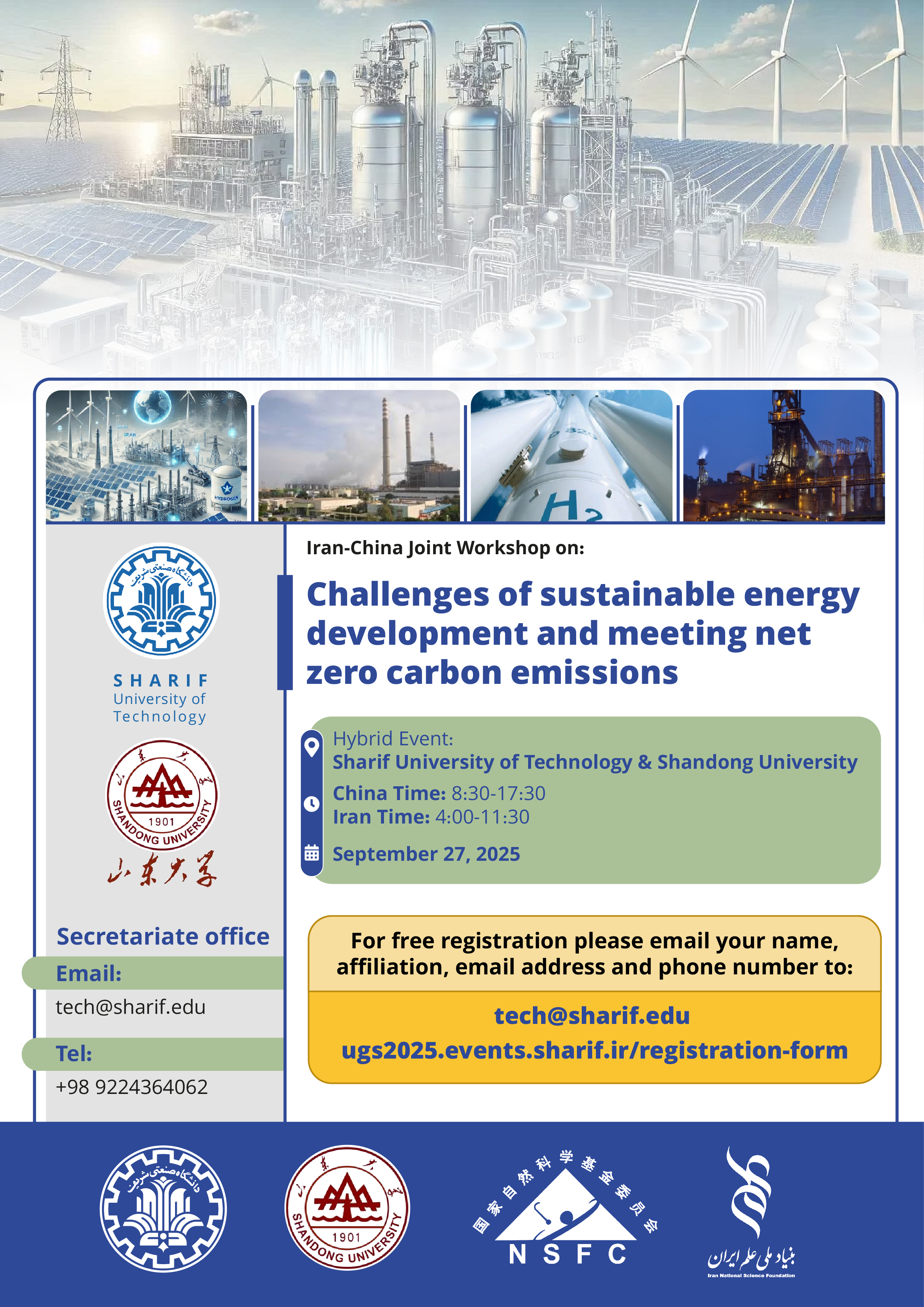 کارگاه مشترک بین دانشگاه صنعتی شریف و دانشگاه شاندونگ چین با عنوان "چالشهای توسعه انرژی پایدار و رسیدن به شرایط صفر خالص انتشار کربن" در روز 27 سپتامبر (5 مهر) برگزار خواهد شد.
